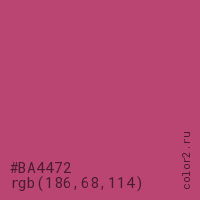 Цвет #BA4472 в цветовой модели RGB обозначается тремя октетами (186, 68, 114) в десятичном формате и #BA4472 в шестнадцатиричном (hex) формате, которые являются интенсивностью красного 186 (hex BA), интенсивность зелёного 68 (hex 44) и интенсивность синего 114 (hex 72).