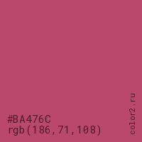 Цвет #BA476C в цветовой модели RGB обозначается тремя октетами (186, 71, 108) в десятичном формате и #BA476C в шестнадцатиричном (hex) формате, которые являются интенсивностью красного 186 (hex BA), интенсивность зелёного 71 (hex 47) и интенсивность синего 108 (hex 6C).