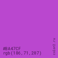 Цвет #BA47CF в цветовой модели RGB обозначается тремя октетами (186, 71, 207) в десятичном формате и #BA47CF в шестнадцатиричном (hex) формате, которые являются интенсивностью красного 186 (hex BA), интенсивность зелёного 71 (hex 47) и интенсивность синего 207 (hex CF).