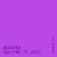Цвет #BA47E8 в цветовой модели RGB обозначается тремя октетами (186, 71, 232) в десятичном формате и #BA47E8 в шестнадцатиричном (hex) формате, которые являются интенсивностью красного 186 (hex BA), интенсивность зелёного 71 (hex 47) и интенсивность синего 232 (hex E8).