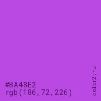 Цвет #BA48E2 в цветовой модели RGB обозначается тремя октетами (186, 72, 226) в десятичном формате и #BA48E2 в шестнадцатиричном (hex) формате, которые являются интенсивностью красного 186 (hex BA), интенсивность зелёного 72 (hex 48) и интенсивность синего 226 (hex E2).