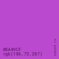 Цвет #BA49CF в цветовой модели RGB обозначается тремя октетами (186, 73, 207) в десятичном формате и #BA49CF в шестнадцатиричном (hex) формате, которые являются интенсивностью красного 186 (hex BA), интенсивность зелёного 73 (hex 49) и интенсивность синего 207 (hex CF).