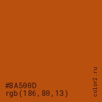 Цвет #BA500D в цветовой модели RGB обозначается тремя октетами (186, 80, 13) в десятичном формате и #BA500D в шестнадцатиричном (hex) формате, которые являются интенсивностью красного 186 (hex BA), интенсивность зелёного 80 (hex 50) и интенсивность синего 13 (hex 0D).