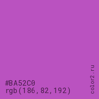 Цвет #BA52C0 в цветовой модели RGB обозначается тремя октетами (186, 82, 192) в десятичном формате и #BA52C0 в шестнадцатиричном (hex) формате, которые являются интенсивностью красного 186 (hex BA), интенсивность зелёного 82 (hex 52) и интенсивность синего 192 (hex C0).
