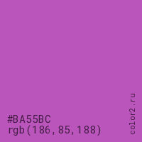 Цвет #BA55BC в цветовой модели RGB обозначается тремя октетами (186, 85, 188) в десятичном формате и #BA55BC в шестнадцатиричном (hex) формате, которые являются интенсивностью красного 186 (hex BA), интенсивность зелёного 85 (hex 55) и интенсивность синего 188 (hex BC).