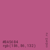 Цвет #BA5684 в цветовой модели RGB обозначается тремя октетами (186, 86, 132) в десятичном формате и #BA5684 в шестнадцатиричном (hex) формате, которые являются интенсивностью красного 186 (hex BA), интенсивность зелёного 86 (hex 56) и интенсивность синего 132 (hex 84).