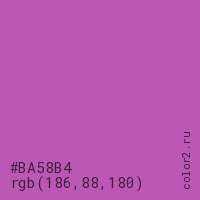 Цвет #BA58B4 в цветовой модели RGB обозначается тремя октетами (186, 88, 180) в десятичном формате и #BA58B4 в шестнадцатиричном (hex) формате, которые являются интенсивностью красного 186 (hex BA), интенсивность зелёного 88 (hex 58) и интенсивность синего 180 (hex B4).