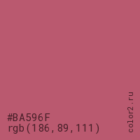 Цвет #BA596F в цветовой модели RGB обозначается тремя октетами (186, 89, 111) в десятичном формате и #BA596F в шестнадцатиричном (hex) формате, которые являются интенсивностью красного 186 (hex BA), интенсивность зелёного 89 (hex 59) и интенсивность синего 111 (hex 6F).