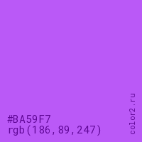 Цвет RGB(186, 89, 247) в процентом отношении количества цвета состоит из 72.9% красного (red), 34.9% зелёного (green) и 96.9% синего (blue).