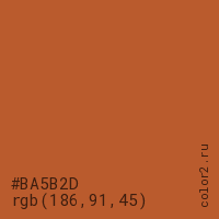 Цвет #BA5B2D в цветовой модели RGB обозначается тремя октетами (186, 91, 45) в десятичном формате и #BA5B2D в шестнадцатиричном (hex) формате, которые являются интенсивностью красного 186 (hex BA), интенсивность зелёного 91 (hex 5B) и интенсивность синего 45 (hex 2D).