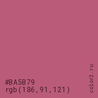 Цвет #BA5B79 в цветовой модели RGB обозначается тремя октетами (186, 91, 121) в десятичном формате и #BA5B79 в шестнадцатиричном (hex) формате, которые являются интенсивностью красного 186 (hex BA), интенсивность зелёного 91 (hex 5B) и интенсивность синего 121 (hex 79).