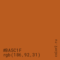 Цвет #BA5C1F в цветовой модели RGB обозначается тремя октетами (186, 92, 31) в десятичном формате и #BA5C1F в шестнадцатиричном (hex) формате, которые являются интенсивностью красного 186 (hex BA), интенсивность зелёного 92 (hex 5C) и интенсивность синего 31 (hex 1F).