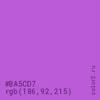 Цвет #BA5CD7 в цветовой модели RGB обозначается тремя октетами (186, 92, 215) в десятичном формате и #BA5CD7 в шестнадцатиричном (hex) формате, которые являются интенсивностью красного 186 (hex BA), интенсивность зелёного 92 (hex 5C) и интенсивность синего 215 (hex D7).