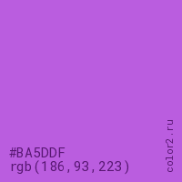Цвет #BA5DDF в цветовой модели RGB обозначается тремя октетами (186, 93, 223) в десятичном формате и #BA5DDF в шестнадцатиричном (hex) формате, которые являются интенсивностью красного 186 (hex BA), интенсивность зелёного 93 (hex 5D) и интенсивность синего 223 (hex DF).