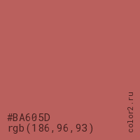 Цвет #BA605D в цветовой модели RGB обозначается тремя октетами (186, 96, 93) в десятичном формате и #BA605D в шестнадцатиричном (hex) формате, которые являются интенсивностью красного 186 (hex BA), интенсивность зелёного 96 (hex 60) и интенсивность синего 93 (hex 5D).