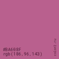 Цвет #BA608F в цветовой модели RGB обозначается тремя октетами (186, 96, 143) в десятичном формате и #BA608F в шестнадцатиричном (hex) формате, которые являются интенсивностью красного 186 (hex BA), интенсивность зелёного 96 (hex 60) и интенсивность синего 143 (hex 8F).