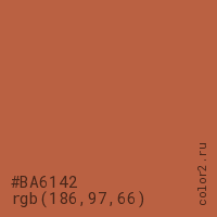 Цвет #BA6142 в цветовой модели RGB обозначается тремя октетами (186, 97, 66) в десятичном формате и #BA6142 в шестнадцатиричном (hex) формате, которые являются интенсивностью красного 186 (hex BA), интенсивность зелёного 97 (hex 61) и интенсивность синего 66 (hex 42).