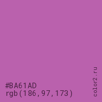 Цвет #BA61AD в цветовой модели RGB обозначается тремя октетами (186, 97, 173) в десятичном формате и #BA61AD в шестнадцатиричном (hex) формате, которые являются интенсивностью красного 186 (hex BA), интенсивность зелёного 97 (hex 61) и интенсивность синего 173 (hex AD).