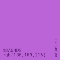 Цвет #BA64D8 в цветовой модели RGB обозначается тремя октетами (186, 100, 216) в десятичном формате и #BA64D8 в шестнадцатиричном (hex) формате, которые являются интенсивностью красного 186 (hex BA), интенсивность зелёного 100 (hex 64) и интенсивность синего 216 (hex D8).