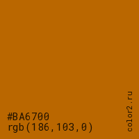 Цвет #BA6700 в цветовой модели RGB обозначается тремя октетами (186, 103, 0) в десятичном формате и #BA6700 в шестнадцатиричном (hex) формате, которые являются интенсивностью красного 186 (hex BA), интенсивность зелёного 103 (hex 67) и интенсивность синего 0 (hex 00).
