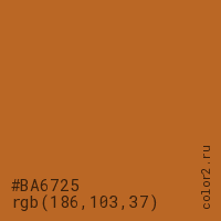 Цвет #BA6725 в цветовой модели RGB обозначается тремя октетами (186, 103, 37) в десятичном формате и #BA6725 в шестнадцатиричном (hex) формате, которые являются интенсивностью красного 186 (hex BA), интенсивность зелёного 103 (hex 67) и интенсивность синего 37 (hex 25).