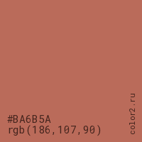 Цвет #BA6B5A в цветовой модели RGB обозначается тремя октетами (186, 107, 90) в десятичном формате и #BA6B5A в шестнадцатиричном (hex) формате, которые являются интенсивностью красного 186 (hex BA), интенсивность зелёного 107 (hex 6B) и интенсивность синего 90 (hex 5A).