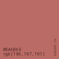 Цвет #BA6B65 в цветовой модели RGB обозначается тремя октетами (186, 107, 101) в десятичном формате и #BA6B65 в шестнадцатиричном (hex) формате, которые являются интенсивностью красного 186 (hex BA), интенсивность зелёного 107 (hex 6B) и интенсивность синего 101 (hex 65).