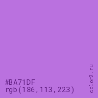Цвет #BA71DF в цветовой модели RGB обозначается тремя октетами (186, 113, 223) в десятичном формате и #BA71DF в шестнадцатиричном (hex) формате, которые являются интенсивностью красного 186 (hex BA), интенсивность зелёного 113 (hex 71) и интенсивность синего 223 (hex DF).