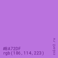 Цвет #BA72DF в цветовой модели RGB обозначается тремя октетами (186, 114, 223) в десятичном формате и #BA72DF в шестнадцатиричном (hex) формате, которые являются интенсивностью красного 186 (hex BA), интенсивность зелёного 114 (hex 72) и интенсивность синего 223 (hex DF).