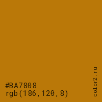 Цвет #BA7808 в цветовой модели RGB обозначается тремя октетами (186, 120, 8) в десятичном формате и #BA7808 в шестнадцатиричном (hex) формате, которые являются интенсивностью красного 186 (hex BA), интенсивность зелёного 120 (hex 78) и интенсивность синего 8 (hex 08).