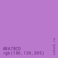 Цвет #BA78CD в цветовой модели RGB обозначается тремя октетами (186, 120, 205) в десятичном формате и #BA78CD в шестнадцатиричном (hex) формате, которые являются интенсивностью красного 186 (hex BA), интенсивность зелёного 120 (hex 78) и интенсивность синего 205 (hex CD).