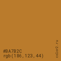 Цвет #BA7B2C в цветовой модели RGB обозначается тремя октетами (186, 123, 44) в десятичном формате и #BA7B2C в шестнадцатиричном (hex) формате, которые являются интенсивностью красного 186 (hex BA), интенсивность зелёного 123 (hex 7B) и интенсивность синего 44 (hex 2C).