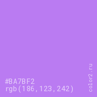 Цвет #BA7BF2 в цветовой модели RGB обозначается тремя октетами (186, 123, 242) в десятичном формате и #BA7BF2 в шестнадцатиричном (hex) формате, которые являются интенсивностью красного 186 (hex BA), интенсивность зелёного 123 (hex 7B) и интенсивность синего 242 (hex F2).
