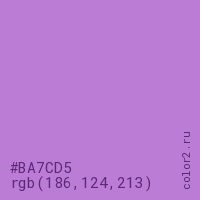 Цвет #BA7CD5 в цветовой модели RGB обозначается тремя октетами (186, 124, 213) в десятичном формате и #BA7CD5 в шестнадцатиричном (hex) формате, которые являются интенсивностью красного 186 (hex BA), интенсивность зелёного 124 (hex 7C) и интенсивность синего 213 (hex D5).
