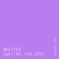 Цвет #BA7CEE в цветовой модели RGB обозначается тремя октетами (186, 124, 238) в десятичном формате и #BA7CEE в шестнадцатиричном (hex) формате, которые являются интенсивностью красного 186 (hex BA), интенсивность зелёного 124 (hex 7C) и интенсивность синего 238 (hex EE).