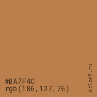 Цвет #BA7F4C в цветовой модели RGB обозначается тремя октетами (186, 127, 76) в десятичном формате и #BA7F4C в шестнадцатиричном (hex) формате, которые являются интенсивностью красного 186 (hex BA), интенсивность зелёного 127 (hex 7F) и интенсивность синего 76 (hex 4C).