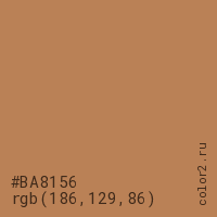 Цвет #BA8156 в цветовой модели RGB обозначается тремя октетами (186, 129, 86) в десятичном формате и #BA8156 в шестнадцатиричном (hex) формате, которые являются интенсивностью красного 186 (hex BA), интенсивность зелёного 129 (hex 81) и интенсивность синего 86 (hex 56).