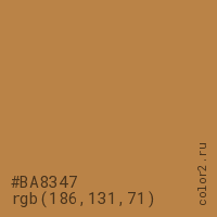 Цвет #BA8347 в цветовой модели RGB обозначается тремя октетами (186, 131, 71) в десятичном формате и #BA8347 в шестнадцатиричном (hex) формате, которые являются интенсивностью красного 186 (hex BA), интенсивность зелёного 131 (hex 83) и интенсивность синего 71 (hex 47).