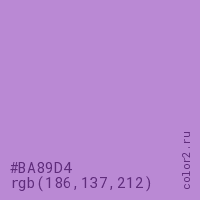 Цвет #BA89D4 в цветовой модели RGB обозначается тремя октетами (186, 137, 212) в десятичном формате и #BA89D4 в шестнадцатиричном (hex) формате, которые являются интенсивностью красного 186 (hex BA), интенсивность зелёного 137 (hex 89) и интенсивность синего 212 (hex D4).