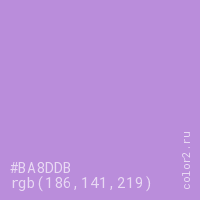 Цвет #BA8DDB в цветовой модели RGB обозначается тремя октетами (186, 141, 219) в десятичном формате и #BA8DDB в шестнадцатиричном (hex) формате, которые являются интенсивностью красного 186 (hex BA), интенсивность зелёного 141 (hex 8D) и интенсивность синего 219 (hex DB).
