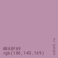 Цвет #BA8FA9 в цветовой модели RGB обозначается тремя октетами (186, 143, 169) в десятичном формате и #BA8FA9 в шестнадцатиричном (hex) формате, которые являются интенсивностью красного 186 (hex BA), интенсивность зелёного 143 (hex 8F) и интенсивность синего 169 (hex A9).