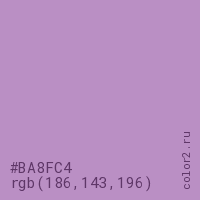 Цвет #BA8FC4 в цветовой модели RGB обозначается тремя октетами (186, 143, 196) в десятичном формате и #BA8FC4 в шестнадцатиричном (hex) формате, которые являются интенсивностью красного 186 (hex BA), интенсивность зелёного 143 (hex 8F) и интенсивность синего 196 (hex C4).