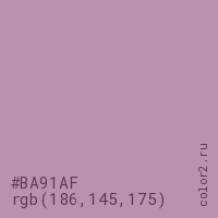 Цвет #BA91AF в цветовой модели RGB обозначается тремя октетами (186, 145, 175) в десятичном формате и #BA91AF в шестнадцатиричном (hex) формате, которые являются интенсивностью красного 186 (hex BA), интенсивность зелёного 145 (hex 91) и интенсивность синего 175 (hex AF).