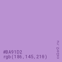 Цвет #BA91D2 в цветовой модели RGB обозначается тремя октетами (186, 145, 210) в десятичном формате и #BA91D2 в шестнадцатиричном (hex) формате, которые являются интенсивностью красного 186 (hex BA), интенсивность зелёного 145 (hex 91) и интенсивность синего 210 (hex D2).