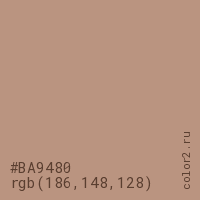Цвет #BA9480 в цветовой модели RGB обозначается тремя октетами (186, 148, 128) в десятичном формате и #BA9480 в шестнадцатиричном (hex) формате, которые являются интенсивностью красного 186 (hex BA), интенсивность зелёного 148 (hex 94) и интенсивность синего 128 (hex 80).