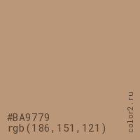 Цвет #BA9779 в цветовой модели RGB обозначается тремя октетами (186, 151, 121) в десятичном формате и #BA9779 в шестнадцатиричном (hex) формате, которые являются интенсивностью красного 186 (hex BA), интенсивность зелёного 151 (hex 97) и интенсивность синего 121 (hex 79).