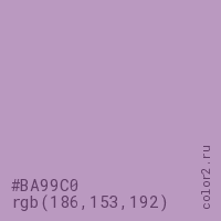 Цвет #BA99C0 в цветовой модели RGB обозначается тремя октетами (186, 153, 192) в десятичном формате и #BA99C0 в шестнадцатиричном (hex) формате, которые являются интенсивностью красного 186 (hex BA), интенсивность зелёного 153 (hex 99) и интенсивность синего 192 (hex C0).