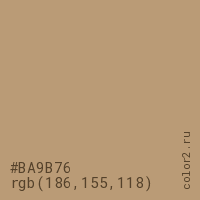 Цвет #BA9B76 в цветовой модели RGB обозначается тремя октетами (186, 155, 118) в десятичном формате и #BA9B76 в шестнадцатиричном (hex) формате, которые являются интенсивностью красного 186 (hex BA), интенсивность зелёного 155 (hex 9B) и интенсивность синего 118 (hex 76).