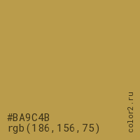 Цвет #BA9C4B в цветовой модели RGB обозначается тремя октетами (186, 156, 75) в десятичном формате и #BA9C4B в шестнадцатиричном (hex) формате, которые являются интенсивностью красного 186 (hex BA), интенсивность зелёного 156 (hex 9C) и интенсивность синего 75 (hex 4B).
