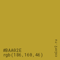 Цвет #BAA02E в цветовой модели RGB обозначается тремя октетами (186, 160, 46) в десятичном формате и #BAA02E в шестнадцатиричном (hex) формате, которые являются интенсивностью красного 186 (hex BA), интенсивность зелёного 160 (hex A0) и интенсивность синего 46 (hex 2E).